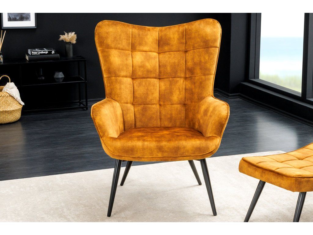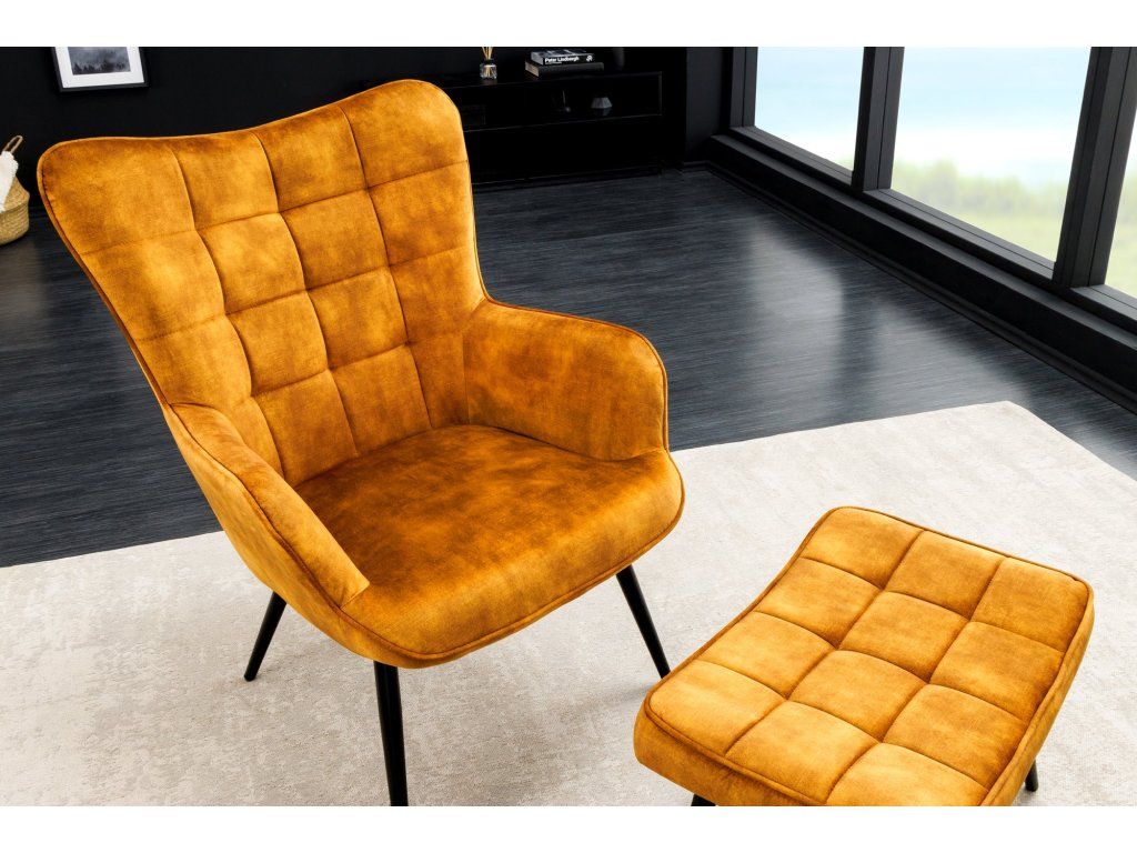 Designové ušák křeslo v hořčicovém odstínu zaujme na první pohled svým výrazným vzhledem a pravidelným prošíváním, které dodává celému křeslu elegantní a moderní charakter. Díky vyššímu opěradlu a typickým bočním „uším“ vytváří příjemné a útulné místo pro odpočinek.