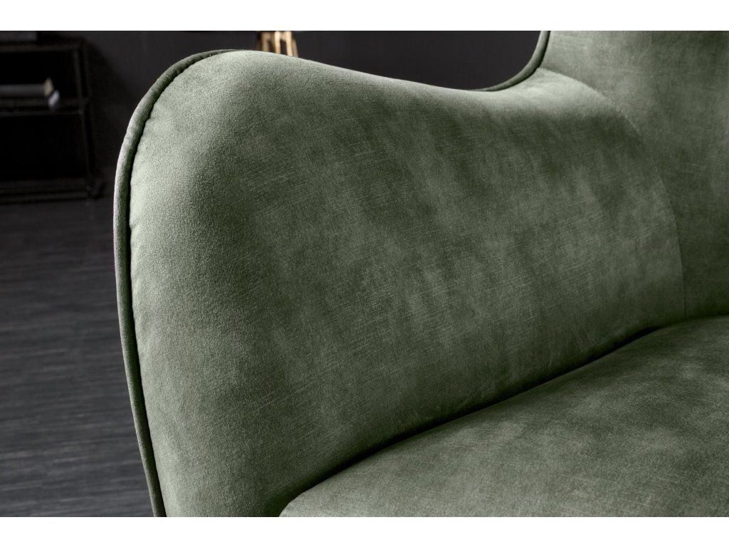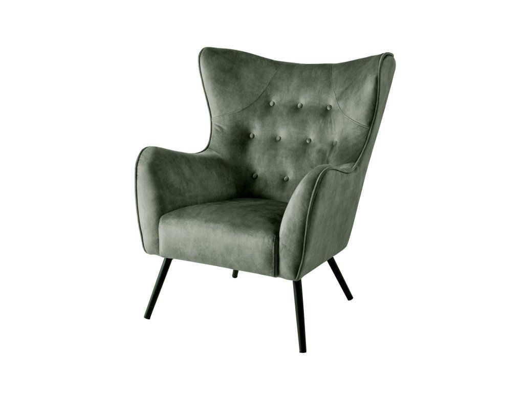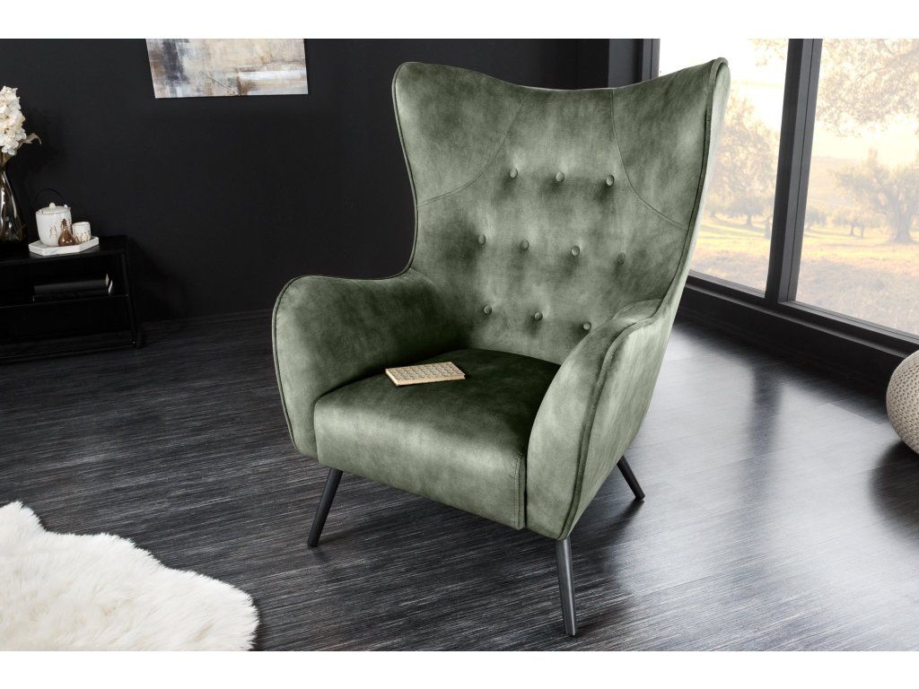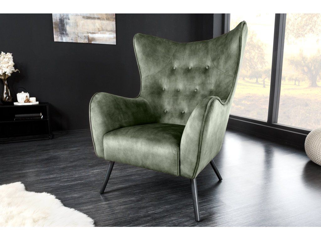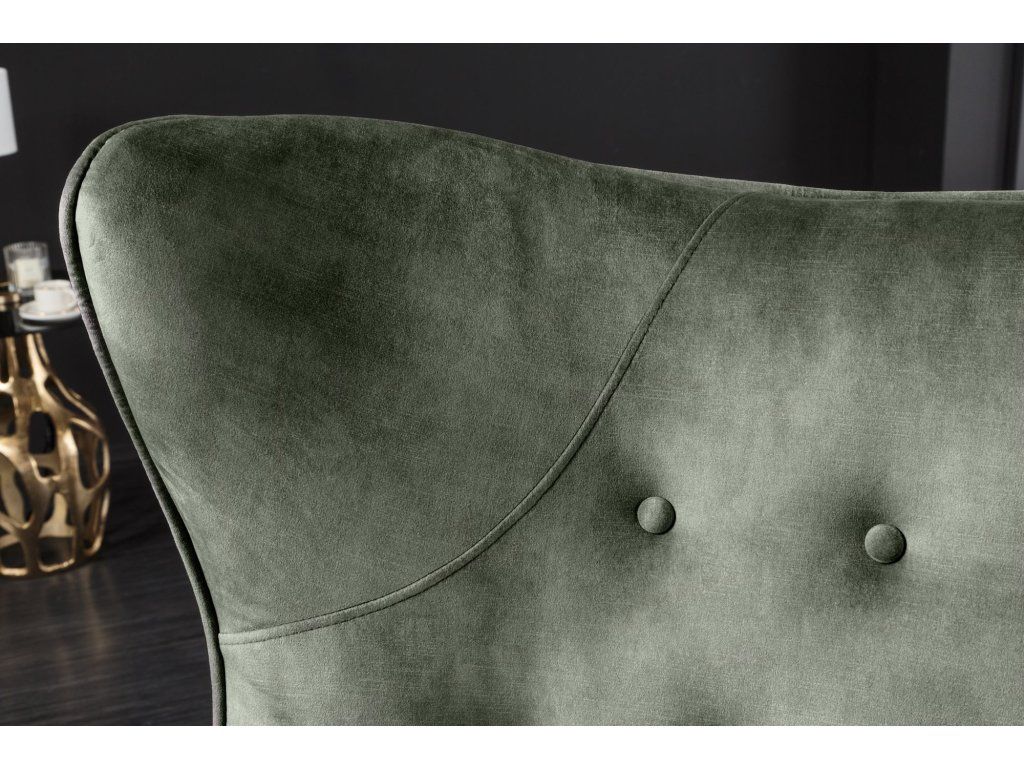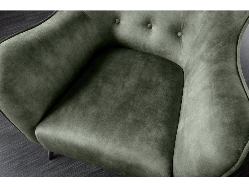Designové ušák křeslo v hlubokém zeleném odstínu zaujme svým výrazným tvarem a jemným prošíváním s knoflíky, které dodávají celému křeslu elegantní a lehce luxusní vzhled. Díky vyššímu opěradlu a typickým bočním „uším“ poskytuje příjemné opření a vytváří ideální místo pro relaxaci.