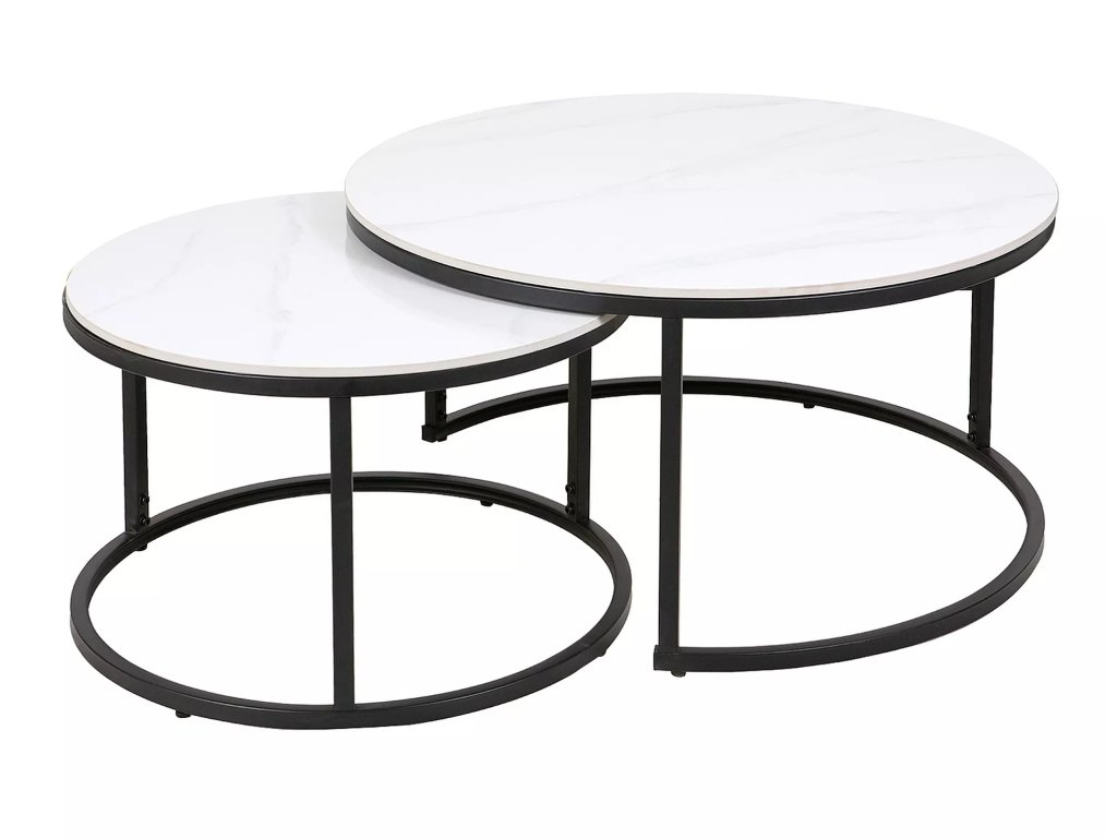 Sada konferenčních stolků FERRANTE – 2 ks (Ø 80 × 42 cm a Ø 60 × 38 cm), bílý mramorový dekor / černá kovová podnož