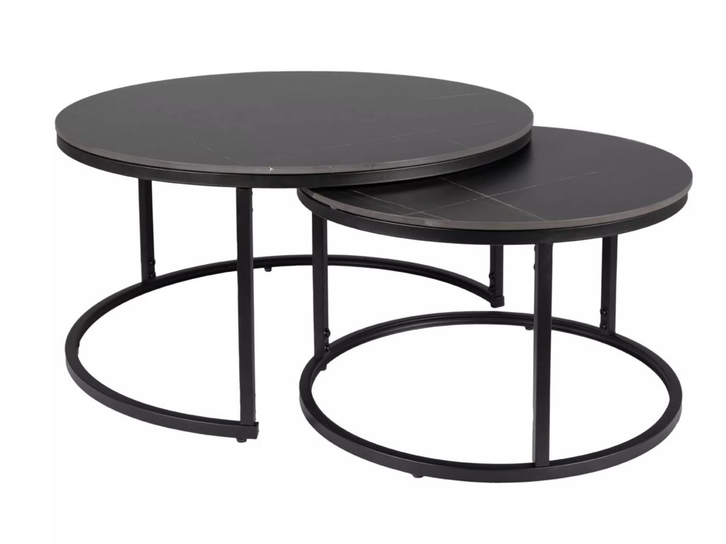 Černá kovová konstrukce v matném provedení zajistí stabilitu i dlouhou životnost. Stolky lze používat samostatně, nebo menší stůl zasunout pod větší a šetřit tak místo. Ideální pro moderní i industriální obývací pokoje.