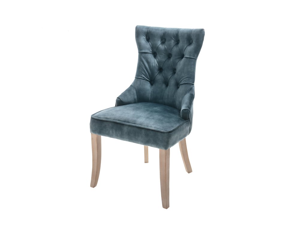 Dominantní barva sedáku: modrá;zelená dodá prostoru příjemný výraz a dobře se kombinuje s přírodními i kontrastními tóny. Design odpovídá stylu designový, moderní, takže židle dobře zapadne do současných domácností i modernějších provozů. Povrch sedáku z materiálu samet je příjemný na dotek a při běžném používání praktický na údržbu. Konstrukce s nohami z masivní dřevo přidává stabilitu a pevný posed. Židle je bez područek, díky čemuž se snadno zasune pod stůl a šetří místo u jídelního setu.