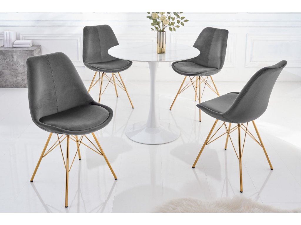 Dominantní barva sedáku: šedá dodá prostoru příjemný výraz a dobře se kombinuje s přírodními i kontrastními tóny. Design odpovídá stylu designový, moderní, takže židle dobře zapadne do současných domácností i modernějších provozů. Povrch sedáku z materiálu polyester je příjemný na dotek a při běžném používání praktický na údržbu. Konstrukce s nohami z kov přidává stabilitu a pevný posed. Židle je bez područek, díky čemuž se snadno zasune pod stůl a šetří místo u jídelního setu.