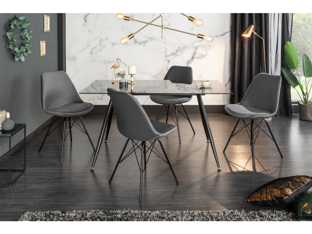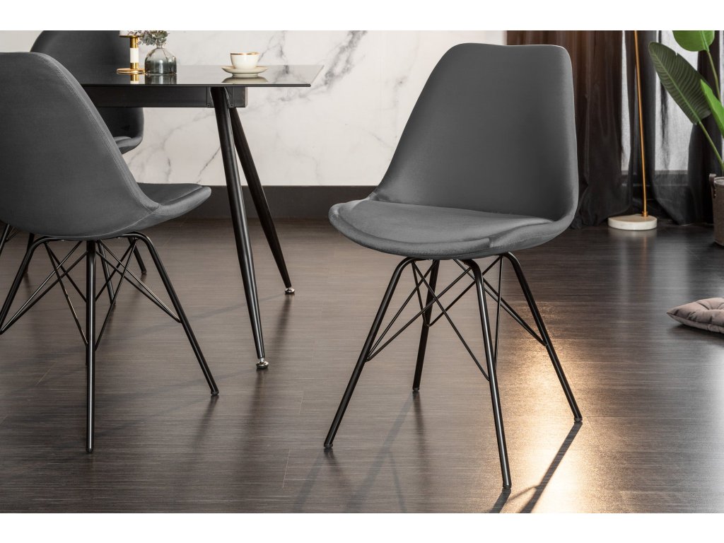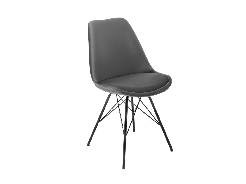 Dominantní barva sedáku: šedá dodá prostoru příjemný výraz a dobře se kombinuje s přírodními i kontrastními tóny. Design odpovídá stylu designový, moderní, takže židle dobře zapadne do současných domácností i modernějších provozů. Povrch sedáku z materiálu samet je příjemný na dotek a při běžném používání praktický na údržbu. Konstrukce s nohami z nan přidává stabilitu a pevný posed. Židle je bez područek, díky čemuž se snadno zasune pod stůl a šetří místo u jídelního setu.
